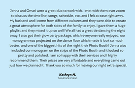 With seamless transitions, on-the-fly announcements, and easy online prep tools for both music and booth design, you can relax and enjoy every moment nowing we’ll handle the soundtrack and the snapshots. Let's curate the perfect vibe and capture the fun at your celebration.